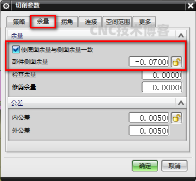 1、打开切削参数-余量,设置负余量,如下图所示: