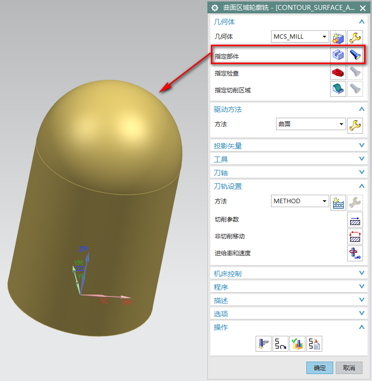 2、在曲面区域轮廓铣界面中,指定部件选择要加工的工件,如下图所示: