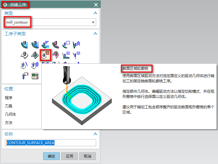 1、在加工界面中,创建工序-mill_contour-曲面区域轮廓铣,如下图所示:
